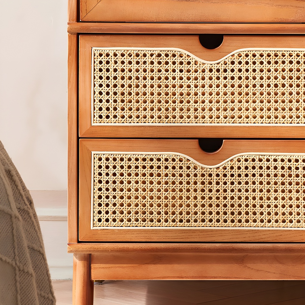 Chất liệu: Gỗ Tần Bì (Ash)_15% + Cao Su Veneer Sồi_85% + Kính + Mây