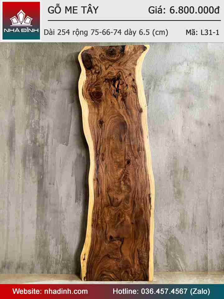 Mặt Bàn Ăn Gỗ Me Tây Nguyên Khối Dài 254 Rộng 75-66-74 Dày 6,5 (cm)