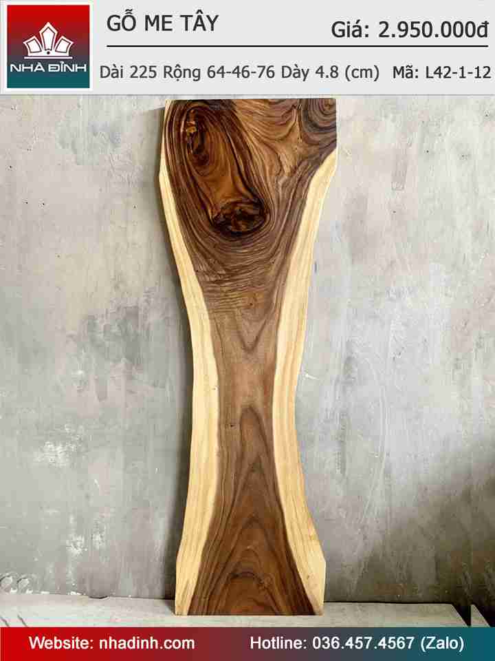 Mặt Bàn Gỗ Me Tây Nguyên Khối Dài 225 Rộng 64-46-76 Dày 4.8 (cm)