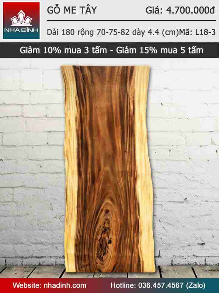 Mặt bàn gỗ Me Tây nguyên khối dài 180 rộng 70-75-82 dày 4,4(cm)