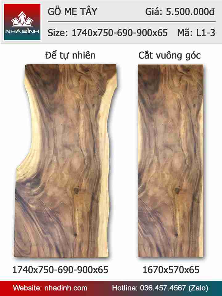 Mặt bàn gỗ Me Tây nguyên khối dài 1m74 rộng 75 - 69 - 90 dày 6,5 (cm)