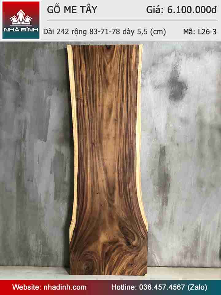 Mặt Bàn Gỗ Me Tây Nguyên Khối Dài 242 Rộng 83-71-78 Dày 5,5 (cm)