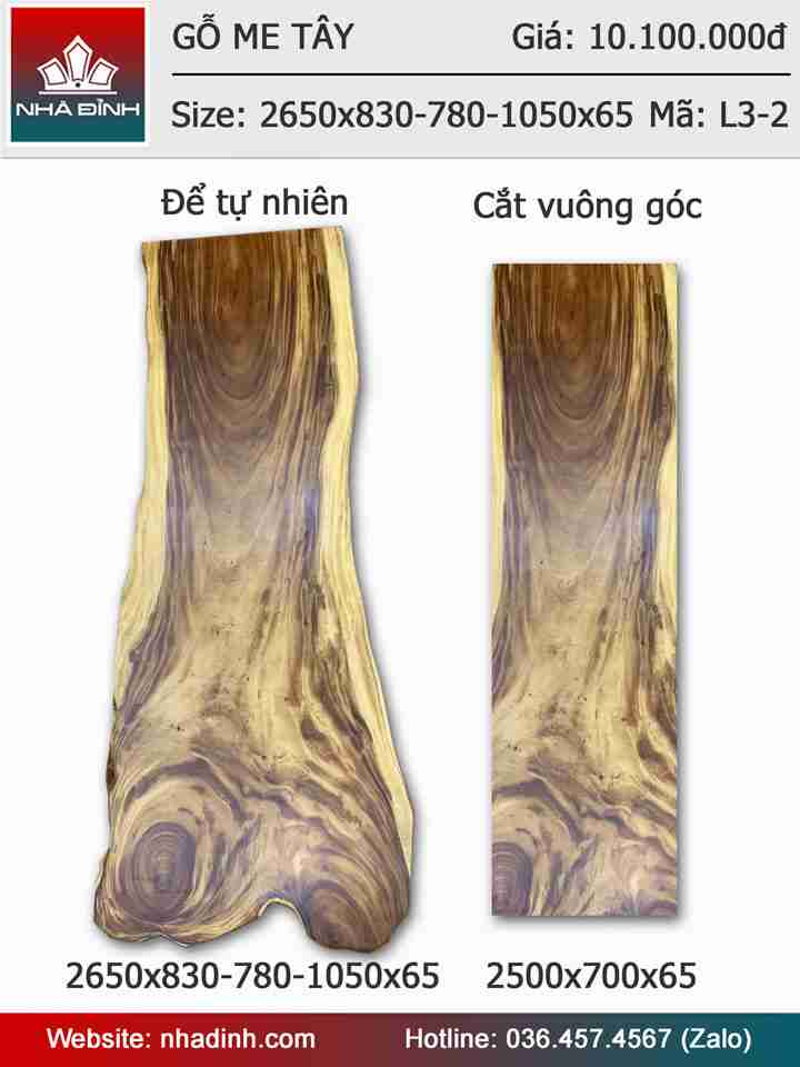 Mặt bàn gỗ Me Tây nguyên tấm dài 2m65 rộng 83-78-105 dày 6,5cm