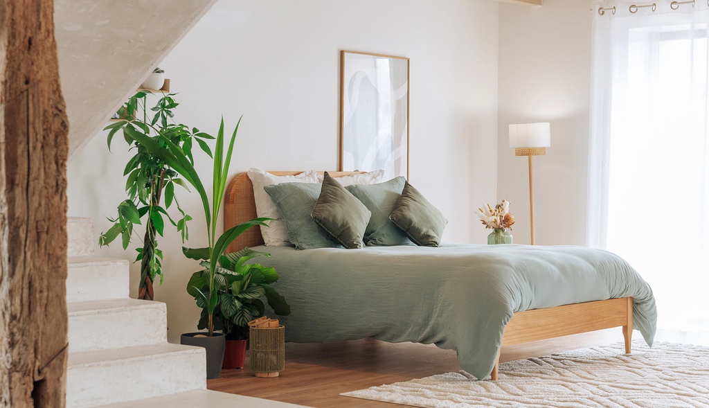 Chất liệu: Gỗ Cao Su Veneer Sồi + Mây
