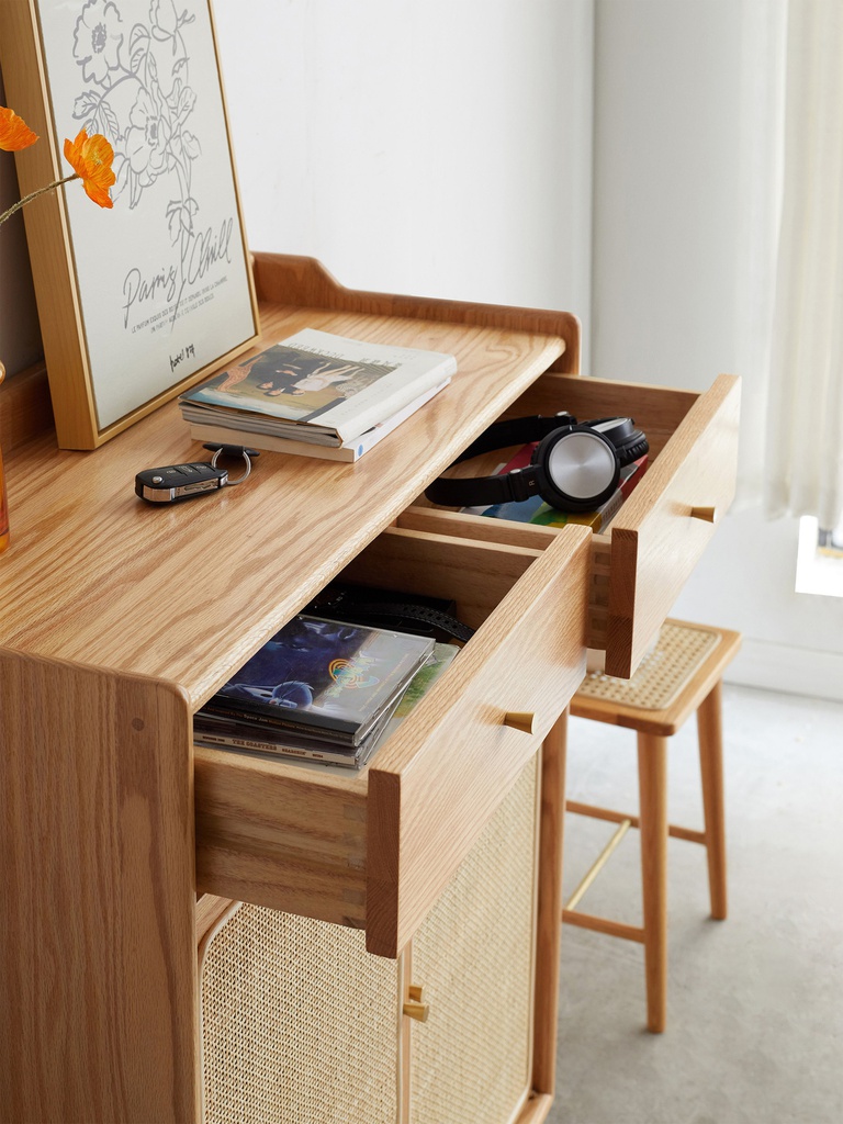 Chất liệu: Gỗ Sồi (Oak)_52% + Ván Cao Su Phủ Veneer Sồi_48% + Mây